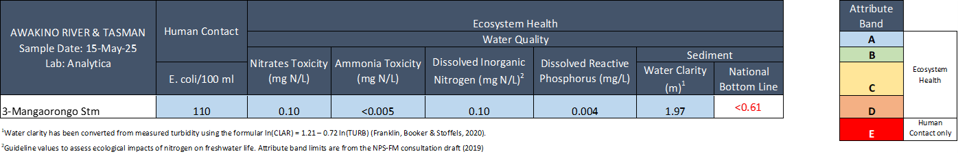 The results in the table below have been graded according to the National Policy Statement for Freshwater Management (NPS-FM, 2020).
