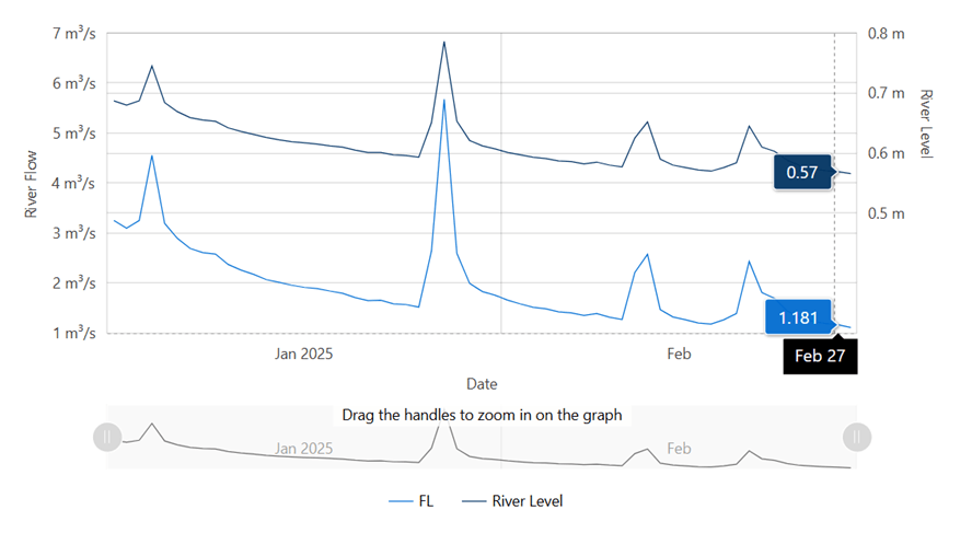The below chart presents continuous data collected by the Waikato Regional Council for Awakino river between 1st January and 28th February 2025. River Level and Flow Rate on the day of sampling (27-Feb) are highlighted.