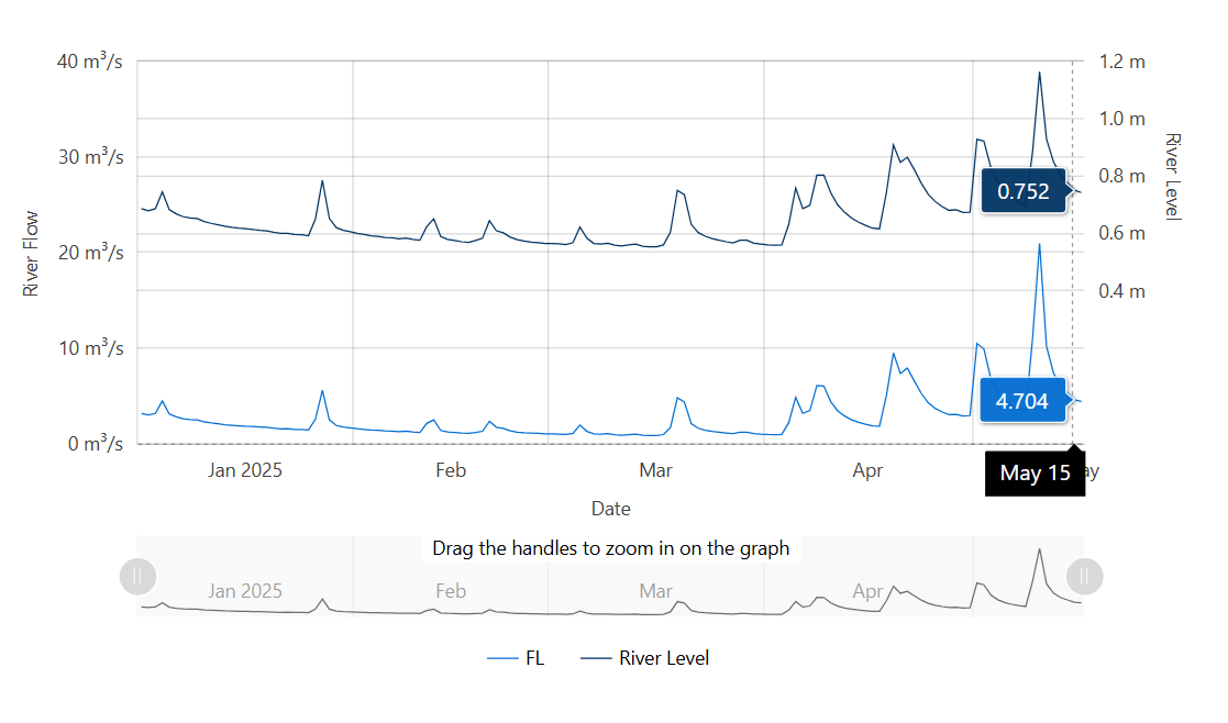 The below chart presents continuous data collected by the Waikato Regional Council for Awakino river between 1st January and 16th May 2025. River Level and Flow Rate on the day of sampling (15-May) are highlighted.