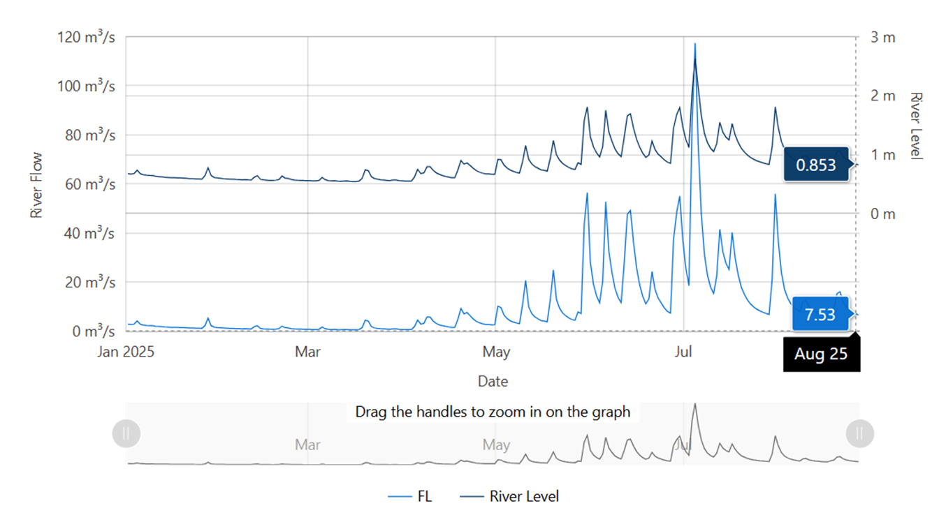 The below chart presents continuous data collected by the Waikato Regional Council for Awakino river between 1st January and 26th August 2025. River Level and Flow Rate on the day of sampling (25-August) are highlighted.