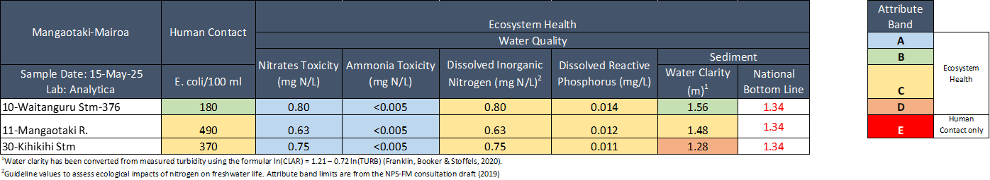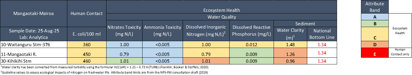 E. coli: Elevated at all sites - none met national health guidelines for swimming. Concentrations were highest at Mangaotaki River – SH3 Bridge and 11-Mangaotaki stream, and were lowest at Waitanguru stream.