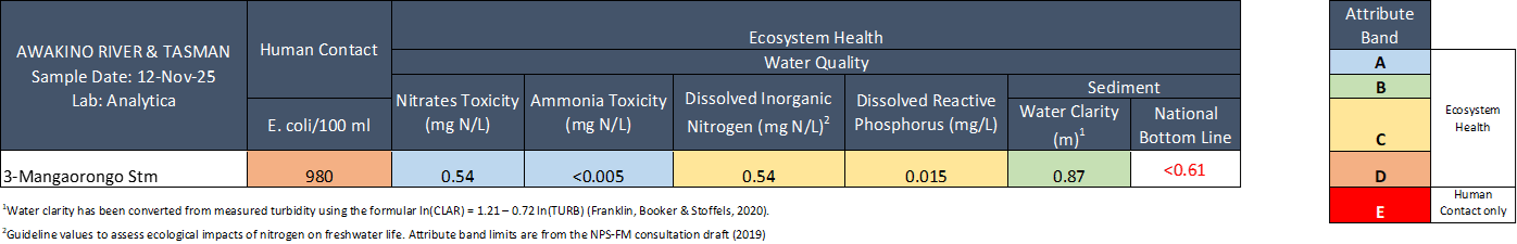 The results in the table below have been graded according to the National Policy Statement for Freshwater Management (NPS-FM, 2020).