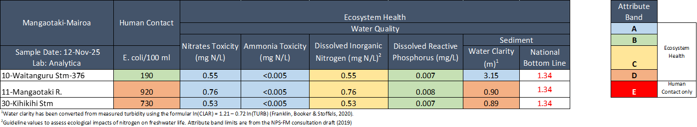 E. coli: Elevated at all sites - none met national health guidelines for swimming. Concentrations were highest at Mangaotaki River – SH3 Bridge and 11-Mangaotaki stream, and were lowest at Waitanguru stream.