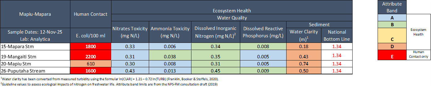 The above results have been assessed against the national freshwater attribute bands under the national policy statement for freshwater (NPS-FM 2020).