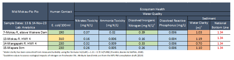 Mokau River – Summary of water quality collected at 15 sites across the Mokau River catchment on 19th November 2024