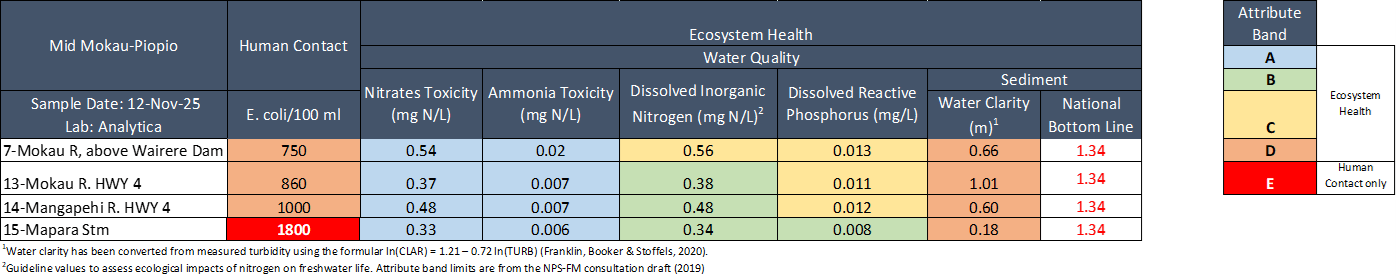 Mokau River – Summary of water quality collected from 15 sites across the Mokau River catchment on 12th November 2025