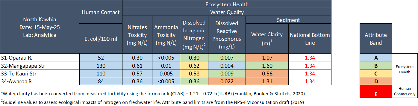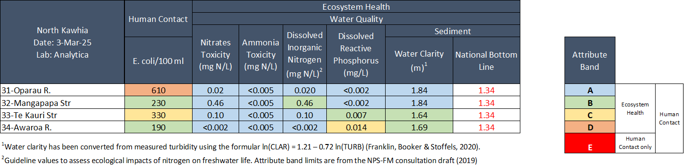 The results in the table below have been graded according to the National Policy Statement for Freshwater Management (NPS-FM, 2020).