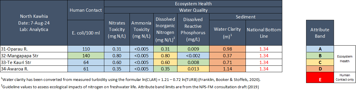 Water quality was Fair across all four sites –Mangapapa stream (Site 32), Te Kauri stream (Site 33), Awaroa river (Site 34) and Oparau river (Site 31).
