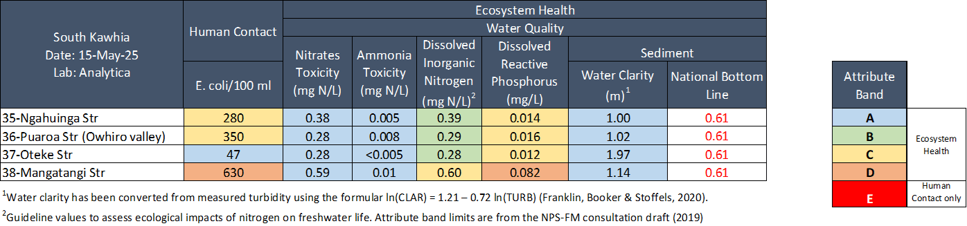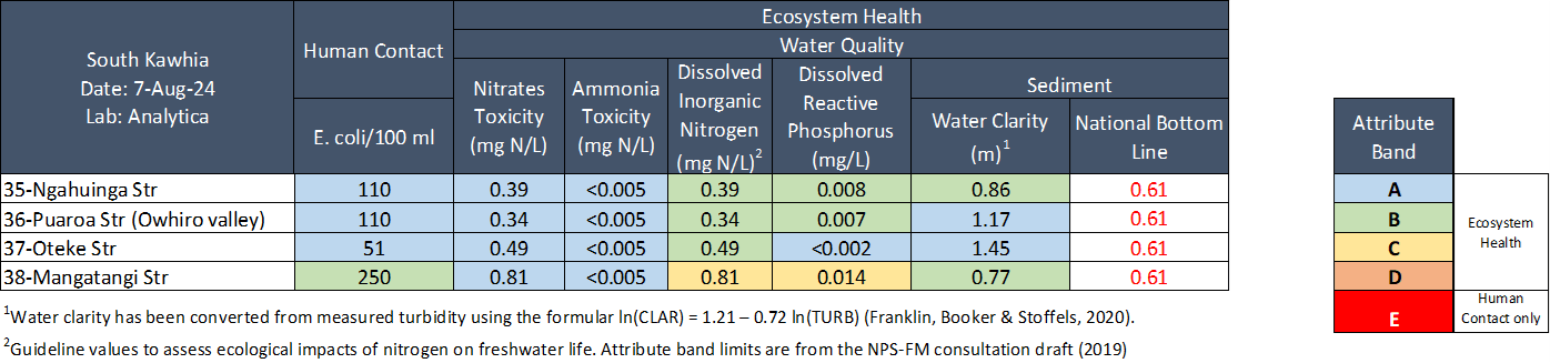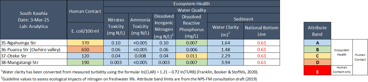 The results in the table below have been graded according to the National Policy Statement for Freshwater Management (NPS-FM, 2020).