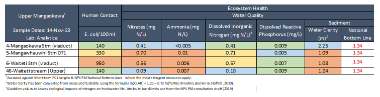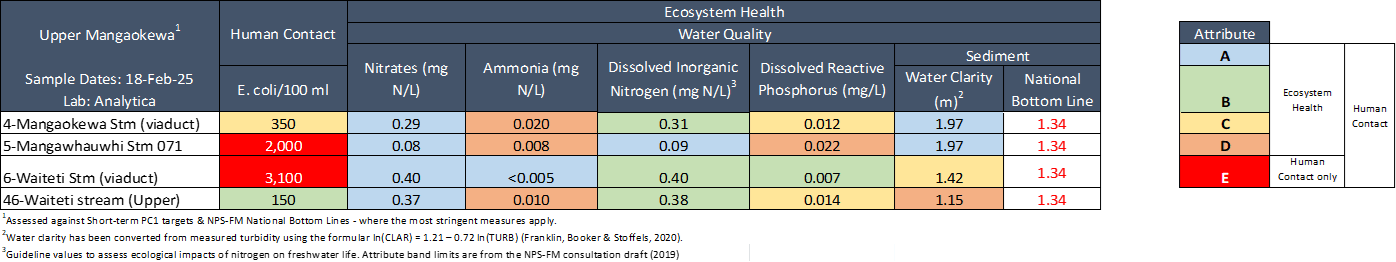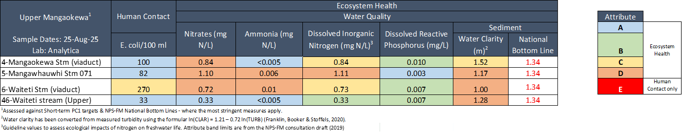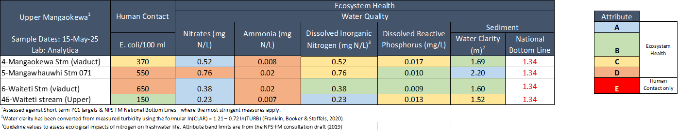 The results in the table below have been graded according to the National Policy Statement for Freshwater Management (NPS-FM, 2020) and Waikato Plan Change One (PC1, 2020), using the strictest applicable measure.