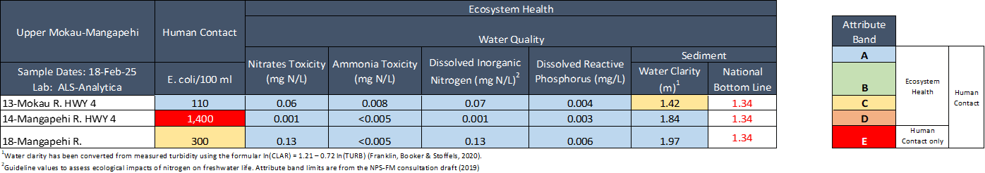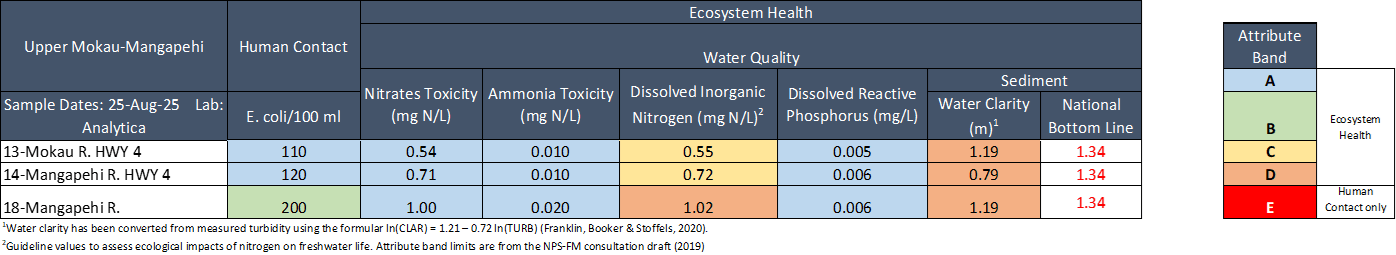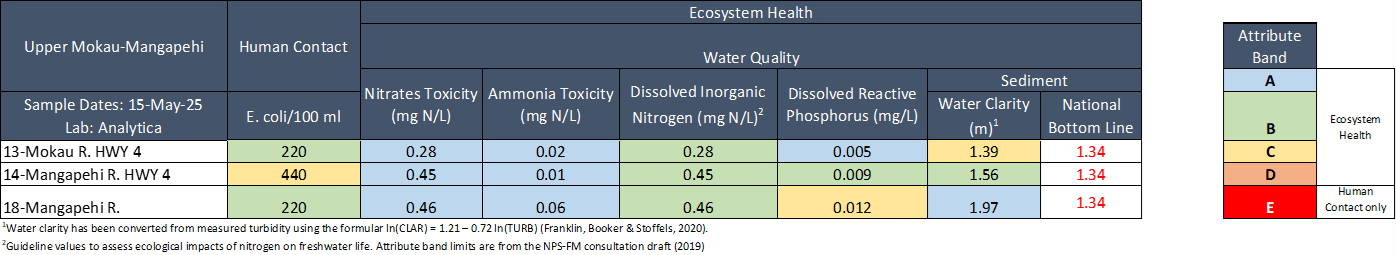 The results in the table below have been graded according to the National Policy Statement for Freshwater Management (NPS-FM, 2020).